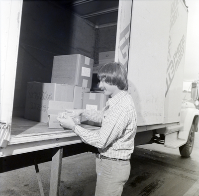 An unidentified General Telephone & Electronics Corporation employee loads boxes onto a Phone Mart truck from a warehouse on Adamo Drive in Tampa, Florida.