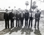 A group of seven employees from General Telephone & Electronics Corporation stand for a group portrait behind a camel at Busch Gardens in Tampa, Florida.
