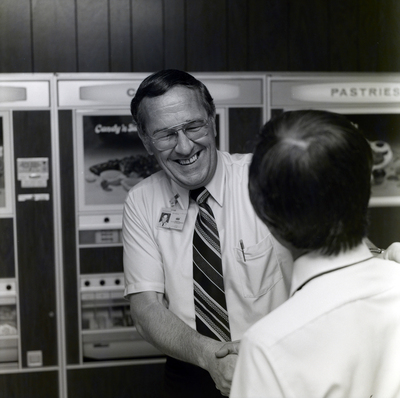 A male General Telephone & Electronics Corporation employee greets a guest in front of vending machines.