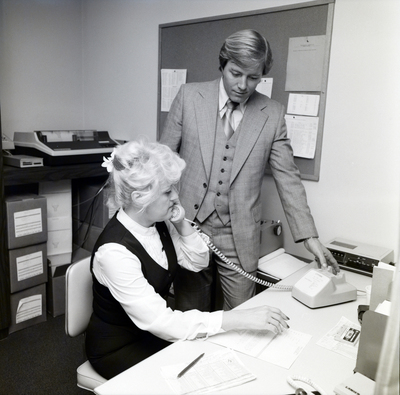 A male General Telephone & Electronics Corporation employee instructs a woman on procedures.