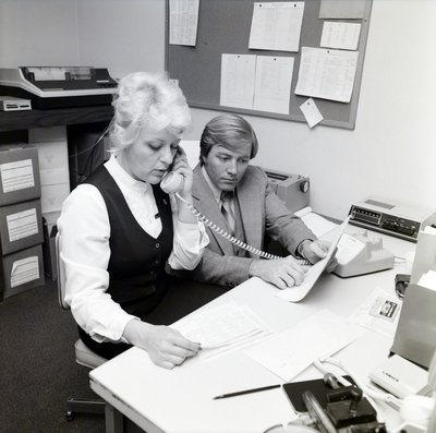 A male General Telephone & Electronics Corporation employee instructs a woman on procedures.