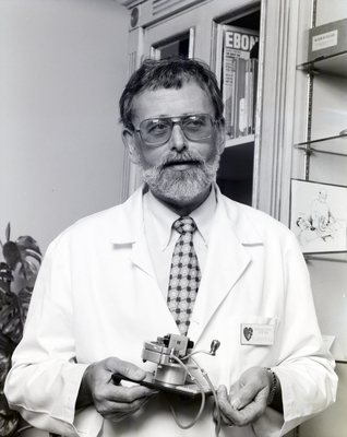 Dr. P.J. Schmidt of the Southwest Florida Blood Bank holds a DeBakey roller pump model for hearts. This photograph was taken for General Telephone & Electronics Corporation.