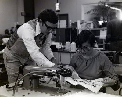 Gandy, George Skip IV, "Man Assists a Woman with a Sewing Machine, C" (1970). Gandy Photographs - Commercial. Image 7752.