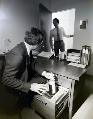 A General Telephone & Electronics Corporation employee pulls a bottle of Canada Deluxe Whiskey from his desk as another man stands in the doorway.