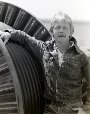 A male General Telephone & Electronics Corporation stands next to a wheel of telephone line.
