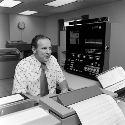 Gandy, George Skip IV, "Employees Work at Desks in Florida Steel Building, R" (1973). Gandy Photographs - Commercial. Image 7840.