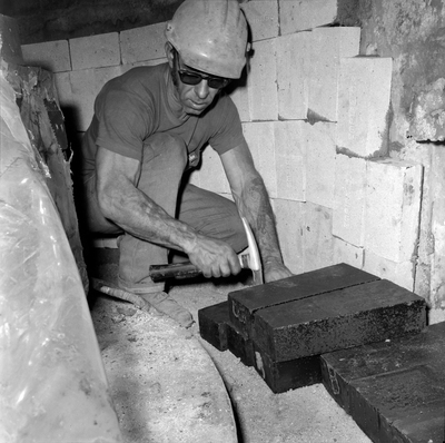An employee in a hard hat works at a Florida Steel building circa 1973.