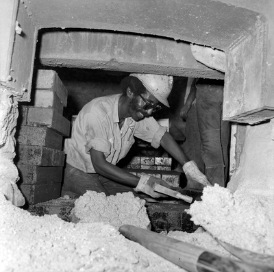 An employee in a hard hat works at a Florida Steel building circa 1973.