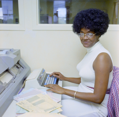Gandy, George Skip IV, "Florida Steel Employee Audrey Wilson at Desk, A" (1974). Gandy Photographs - Commercial. Image 8025.