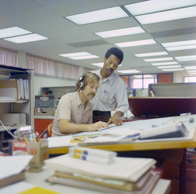 Gandy, George Skip IV, "Two Florida Steel Employees Talk at Desk, J" (1974). Gandy Photographs - Commercial. Image 8042.