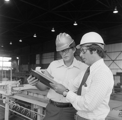 Gandy, George Skip IV, "Two Florida Steel Employees in Hard Hats Consult Clipboard, B" (1974). Gandy Photographs - Commercial. Image 8157.