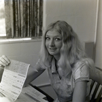 A Florida Steel Corporation employee smiles while sitting at a desk circa 1974.