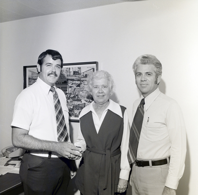 A woman smiles beside two men while receiving a Florida Steel Corporation award of some kind circa 1974.