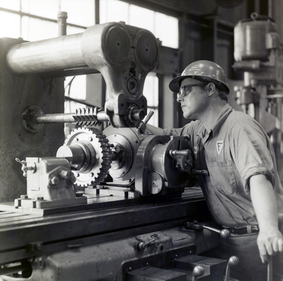 A man in a hard hat tends to machinery in a Florida Steel Corporation plant circa 1974.
