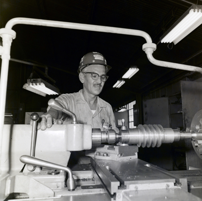A man in a hard hat tends to machinery in a Florida Steel Corporation plant circa 1974.