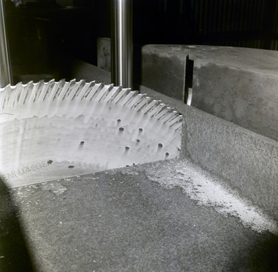 A table saw at a Florida Steel Corporation plant circa 1975.