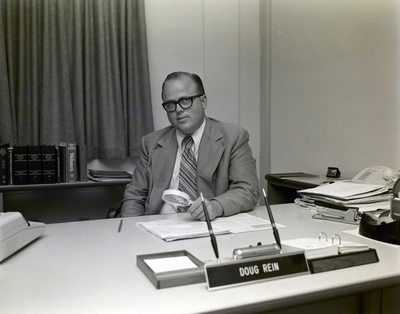 A portrait of Florida Steel Corporation's insurance manager Doug Rein seated at his desk circa 1975.