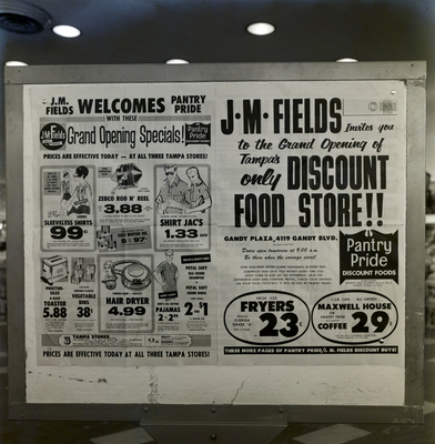 The grand opening of a Pantry Pride supermarket location photographed for Hank Meyer Association. The store likely opened at 5324 Gandy Boulevard on Thursday, June 2, 1966. It was located in the same shopping center as Maas Brothers Store for Homes at 4130 Gandy Boulevard.