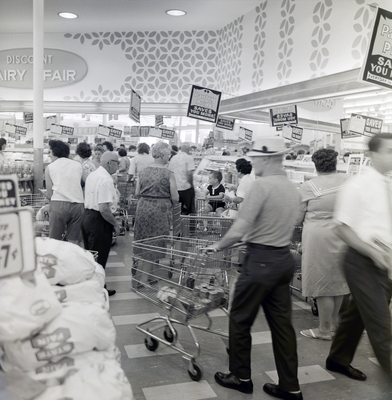 The grand opening of a Pantry Pride supermarket location photographed for Hank Meyer Association. The store likely opened at 5324 Gandy Boulevard on Thursday, June 2, 1966. It was located in the same shopping center as Maas Brothers Store for Homes at 4130 Gandy Boulevard.