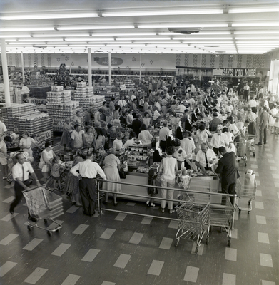 The grand opening of a Pantry Pride supermarket location photographed for Hank Meyer Association. The store likely opened at 5324 Gandy Boulevard on Thursday, June 2, 1966. It was located in the same shopping center as Maas Brothers Store for Homes at 4130 Gandy Boulevard.