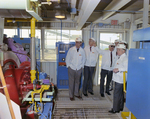 Gold Bond Building Products executives in lab coats and hard hats during a factory tour.