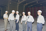 Gold Bond Building Products executives in hard hats touring a warehouse with large stacks of materials.