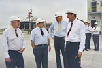 Gold Bond Building Products executives in hard hats at the Mill Area entrance with a docked ship in the background.