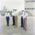 Gold Bond Building Products executives in hard hats at the Mill Area entrance with a docked ship in the background.