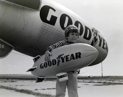 Gandy, George Skip IV, "Child Holding a Toy Goodyear Blimp While Standing Alongside a Actual Blimp, A" (1960). Gandy Photographs - Commercial. Image 8877.