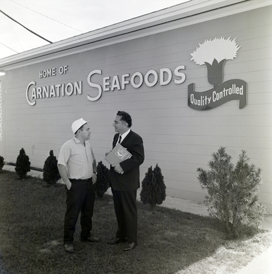A Graco Inc. representative speaking with a worker outside the Carnation Seafoods facility. The company’s signage, including the phrase “Quality Controlled,” is displayed on the building behind them.