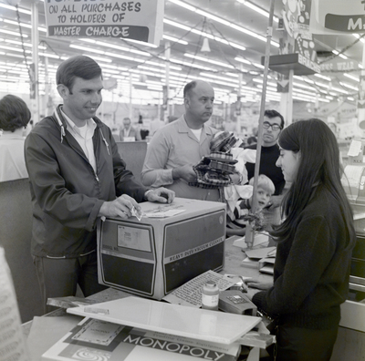 Gandy, George Skip IV, "Man Purchasing Vacuum Cleaner During Master Charge Promotion at Grand Way Department Store" (1970). Gandy Photographs - Commercial. Image 9030.