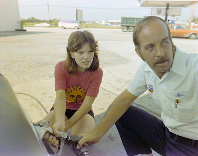 Gandy, George Skip IV, "Man Shows Teen How to Pump Gas, D" (1975). Gandy Photographs - Commercial. Image 9614.