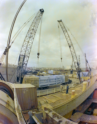 Gandy, George Skip IV, "Gulf Machinery Components Loaded onto Cargo Ship at Industrial Dock, B" (1970). Gandy Photographs - Commercial. Image 9775.