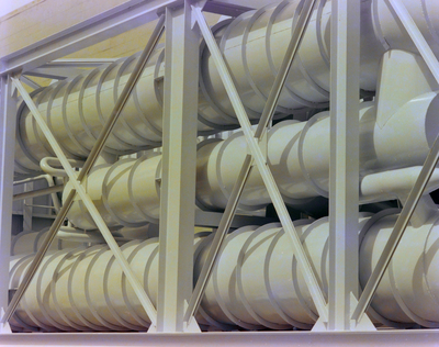 A detailed close-up view of large industrial machinery, emphasizing its structural framework and piping.