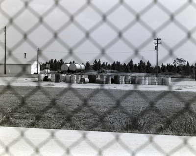 Multiple barrels placed in an open field at the Horizon 2000 Sewer and Solid Waste Management Facility, with larger storage tanks and a small building visible in the background.