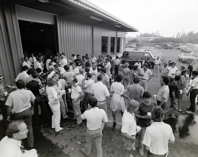 A cookout outside a Hughes Supply warehouse, featuring a large crowd, a beer keg, tents, and a barbecue grill.