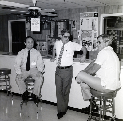 People gathered inside the Hughes Supply store for a cookout, surrounded by equipment.