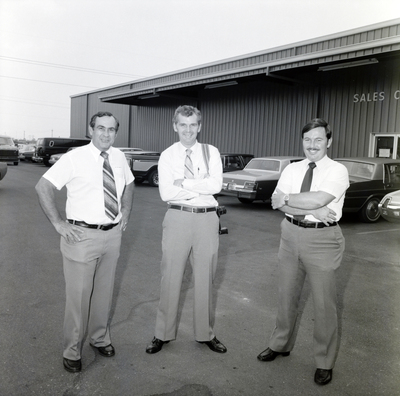 A cookout outside a Hughes Supply warehouse, with three men standing together in the parking lot.
