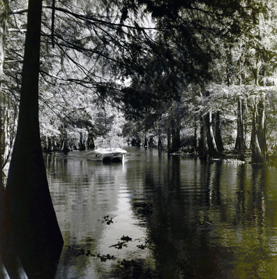 Gandy, George Skip IV, "Boat Through Trees on Tsala Apopka Lake in Floral City" (1960). Gandy Photographs - Natural Scenes and the Environment. Image 640.