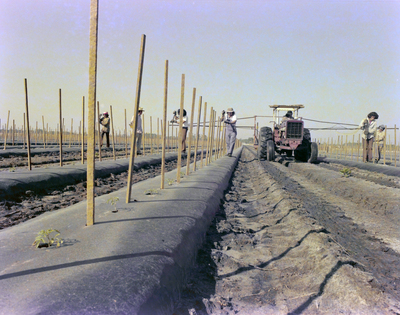 Workers amongst long rows of crops supported by wooden stakes in a rural field. Image taken in association with Gray and Denton Advertising.