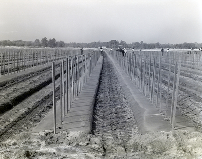 Workers amongst long rows of crops supported by wooden stakes in a rural field. Image taken in association with Gray and Denton Advertising.