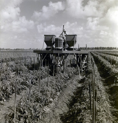 Large agricultural machine operating between rows of staked plants in a cultivated field.