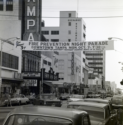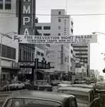 A banner on the overhead electrical lines on North Franklin Street advertising Tampa's Third Fire Prevention Night Parade in downtown Tampa, Monday, October 7th. The event was sponsored by the Tampa Fire Department and Independent Insurance Agents of Greater Tampa, Inc.