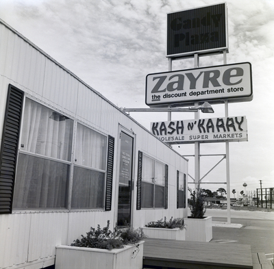 Exterior of First Federal Savings and Loan Association of Tampa, Gandy Boulevard trailer. Next to the building, there is a signboard for Gandy Plaza, Zayre Discount Department Store, and Kash N' Karry Wholesale Supermarket.