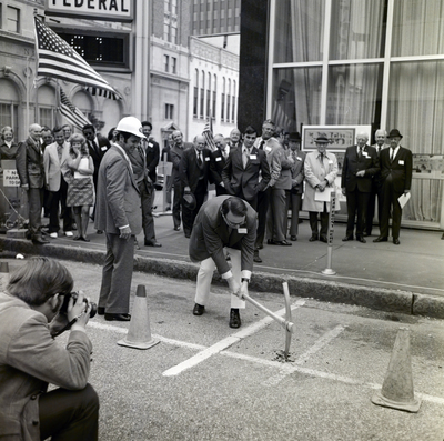 A man strikes a pickaxe into the road in front of the First Federal Savings and Loan Association building in downtown Tampa as a crowd watches.