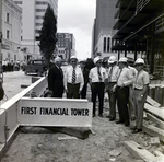 Eight men stand next to the final beam for the First Financial Tower during the topping off ceremony; seven of them wear hardhats. The beam is labeled "First Financial Tower, New Home of the First National Bank of Tampa".