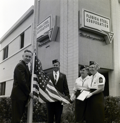 Three members of the American Legion stand by a Florida Steel Corporation employee and an American flag outside of the building.