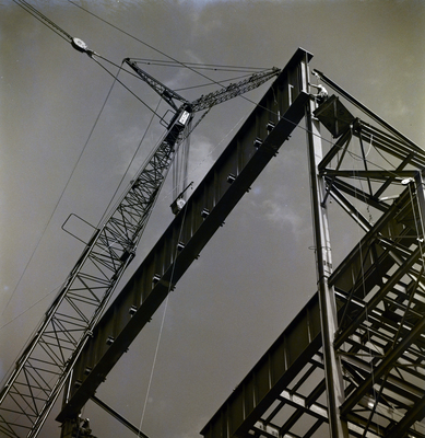 Gandy, George Skip IV, "Employee Grabs Steel Beam from Crane, Gannon Plant, Florida Steel, A" (1965). Gandy Photographs - Streets, Buildings, and Construction. Image 2706.