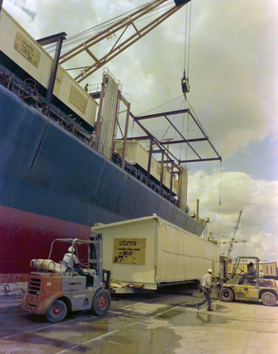 Gandy, George Skip IV, "Crane Placing Pallet from M/V Kelkheim to Land for Fillette Green" (1975). Gandy Photographs - Streets, Buildings, and Construction. Image 3014.