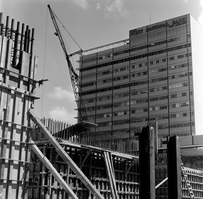 The First National Bank of Miami construction site with a rebar structure and operating crane in Miami, Florida, photographed for Florida Steel Corporation.